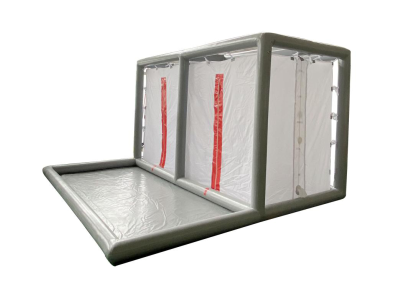 雙人洗消帳篷用于消防人員洗消。操作簡單、耐久性強、需氣量小,自行豎立。外面充氣框架,內掛防水布簾,下面氣囊自然形成儲水池,淋浴間全封閉化,防止污染液體擴散溢流,配備獨立前置洗消池,作為預備洗消人員提前清洗消毒場地。采用雙進雙出,出入口,2間獨立洗消空間,噴淋裝置由10個高壓噴嘴組成,供水管路與供水系統連接,配有電動充氣泵,噴淋系統。有明顯進出口箭頭標識。獨立進出口,防止二次污染。